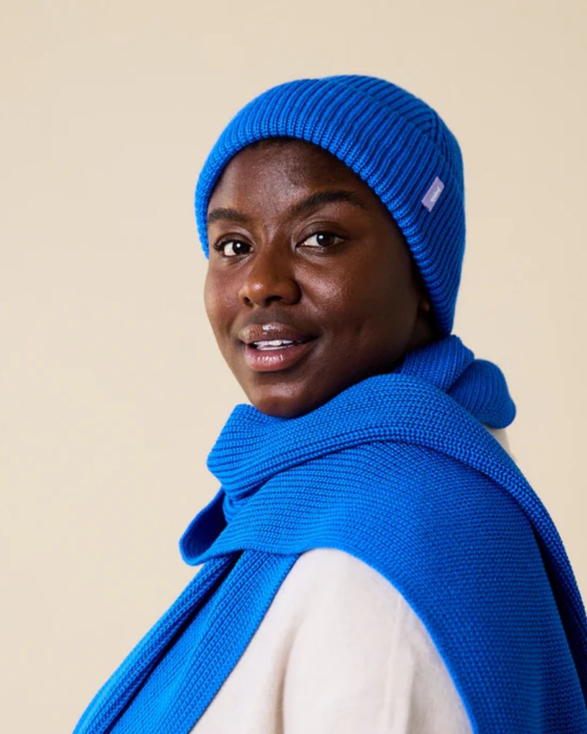 Du suchst das passende Matching - Set? Schau dir den Merino Schal von Popeia in blau an.
