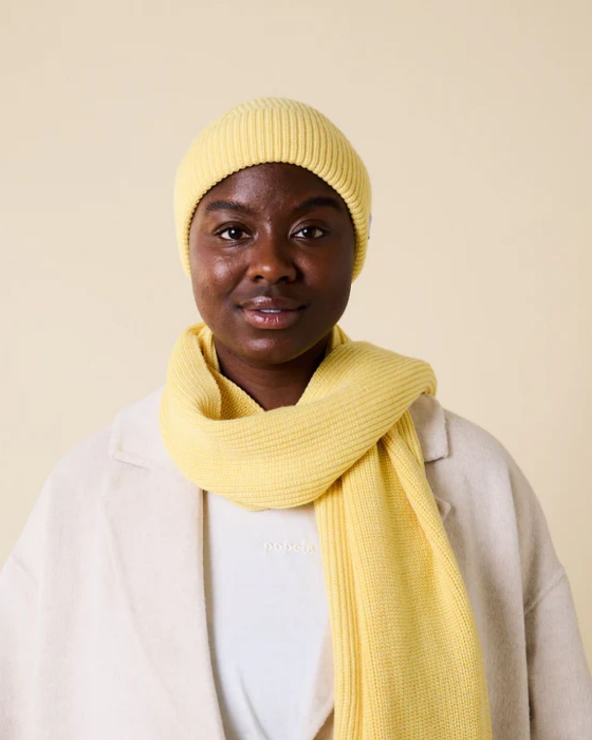 Du suchst das passende Matching - Set? Schau dir den Merino Schal von Popeia in hellgelb an.